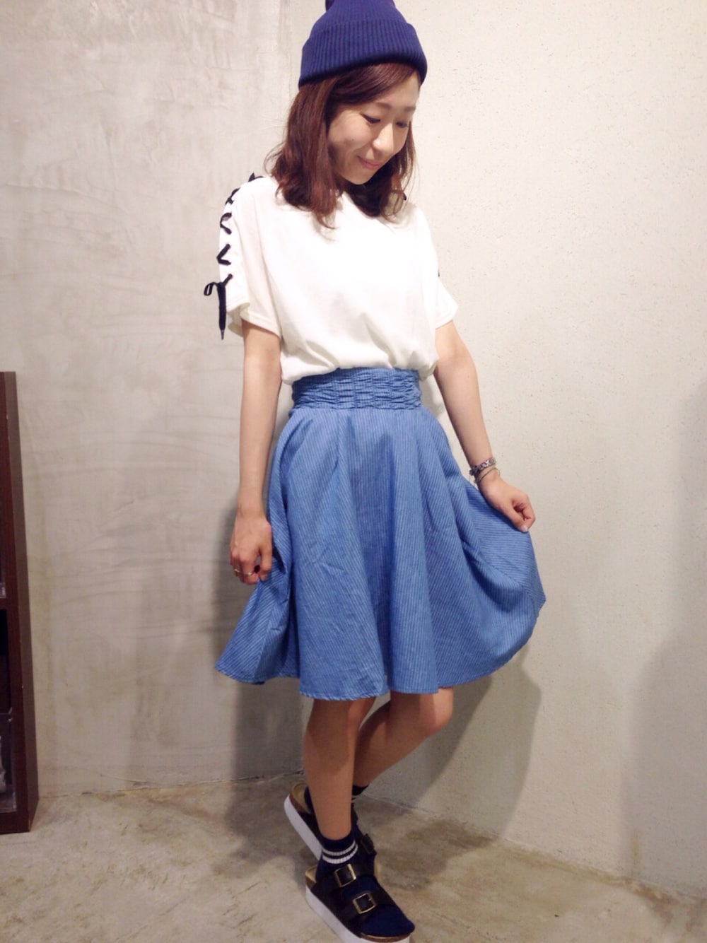 ガーリーカジュアル(^○^) さりげなくストライプのスカートも 形がキレイですよ♪♪♪ ニット帽と靴下をネイビーで合わせて ガーリー度アップしさせてみました!