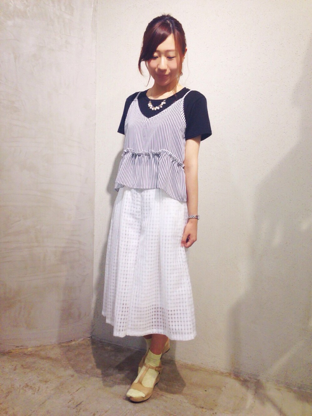 今回のオススメはトップスです! ストライプのキャミとTシャツは なんとセットです\(^o^)/ 4色展開ですが、どれも可愛い! どんなボトムでも合わせやすくて 私も私服で着ちゃってます!笑