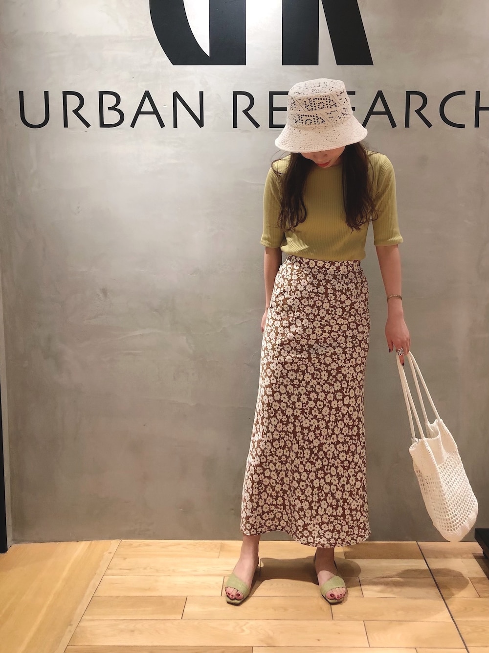 可愛いレースのハットが入荷しております^ ^ ピスタチオカラーのトップスとキャメルのお花柄が新鮮な色合わせです♪
