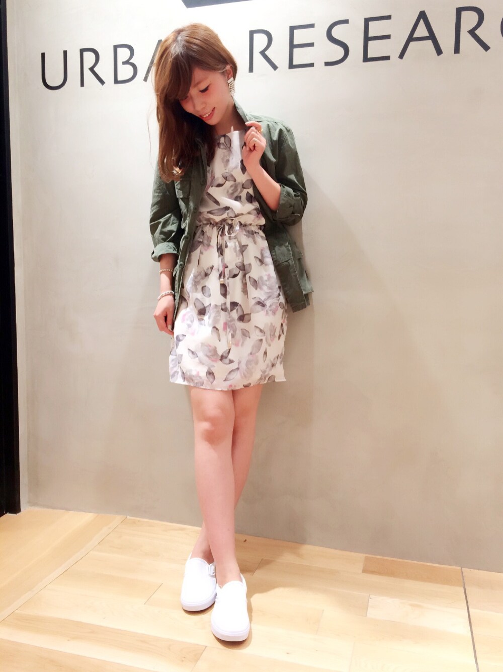 甘めのフラワープリントワンピースを、ミリタリージャケットとスニーカーでピリッと。