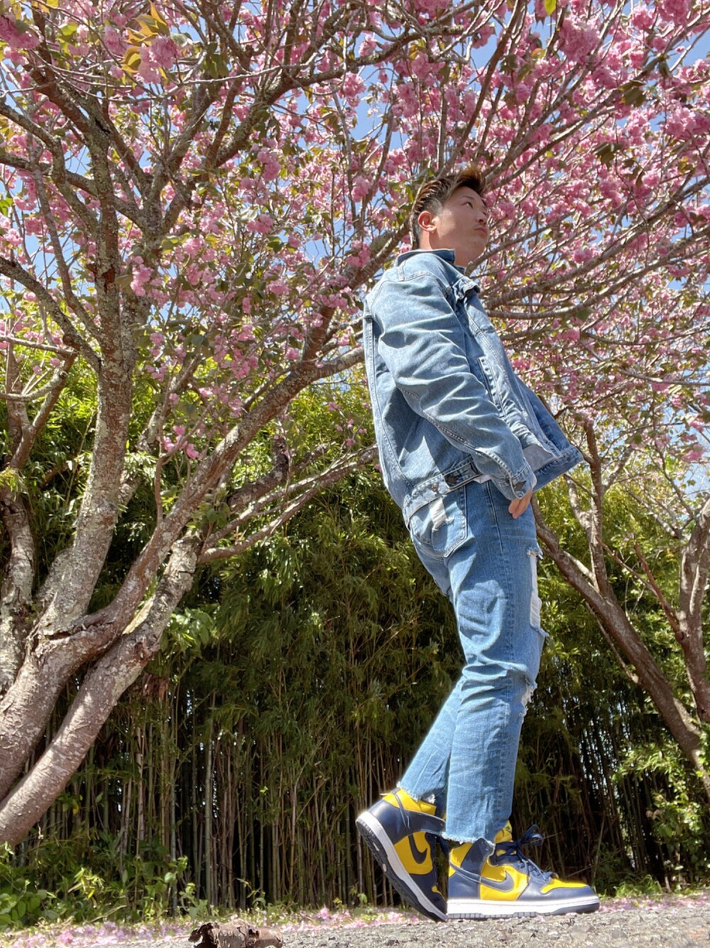 DUNKコーデ NIKE DUNK High Michigan🎖 GAPのデニムジャケットXL🎖 アメリカンサイズなはずなんだけどわりと小さめ? GAPデニムパンツ🎖 セルフダメージです👍大変だった(笑)