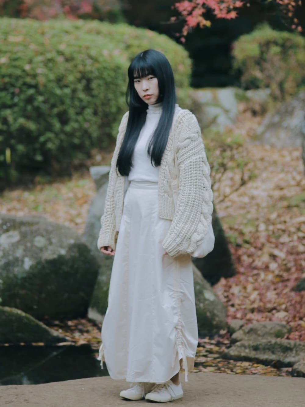 まっしろコーデは夏も冬もだいすき! ざっくりニットカーデにデザインスカート シンプルだけどちょっとくせがあってお気に入り☺️♡