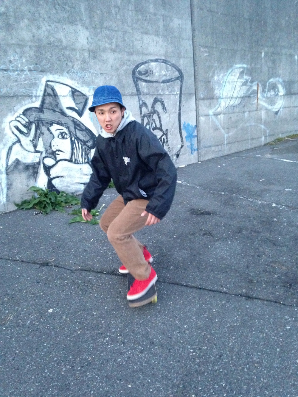 パーカー:REIGNING CHAMP シューズ:VANS ソックス:VANS パンツ:クイックシルバー ジャケット:used これからJACKでスケート! 足元を目立たせるインパクト大の赤いVANSのスニーカーがポイント!