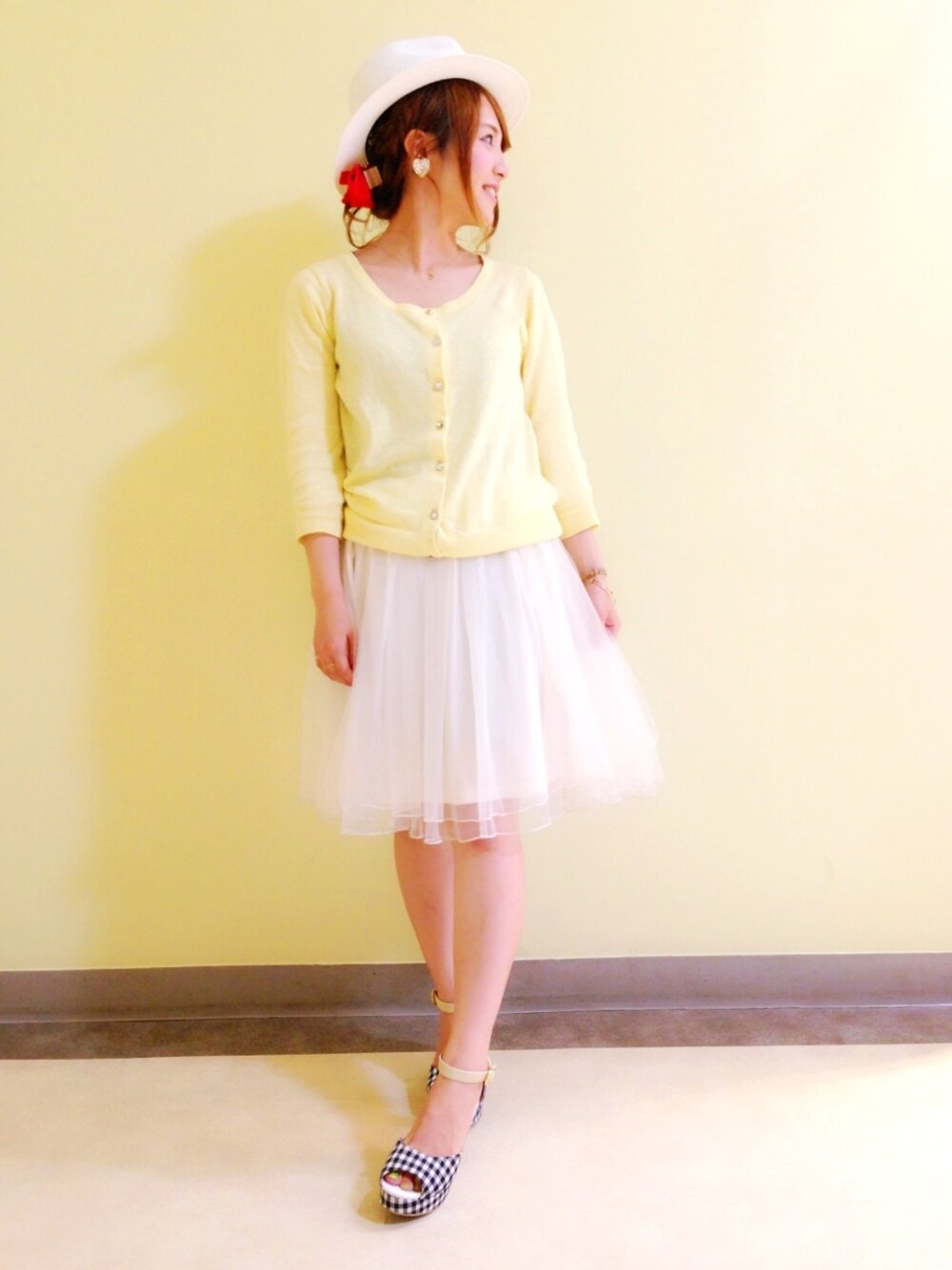 チュールスカートは、 ひざ丈なところがお気に入りです♪ この今年トレンドのイエローのカーディガンは、冷房対策にも使えて愛用中です♪