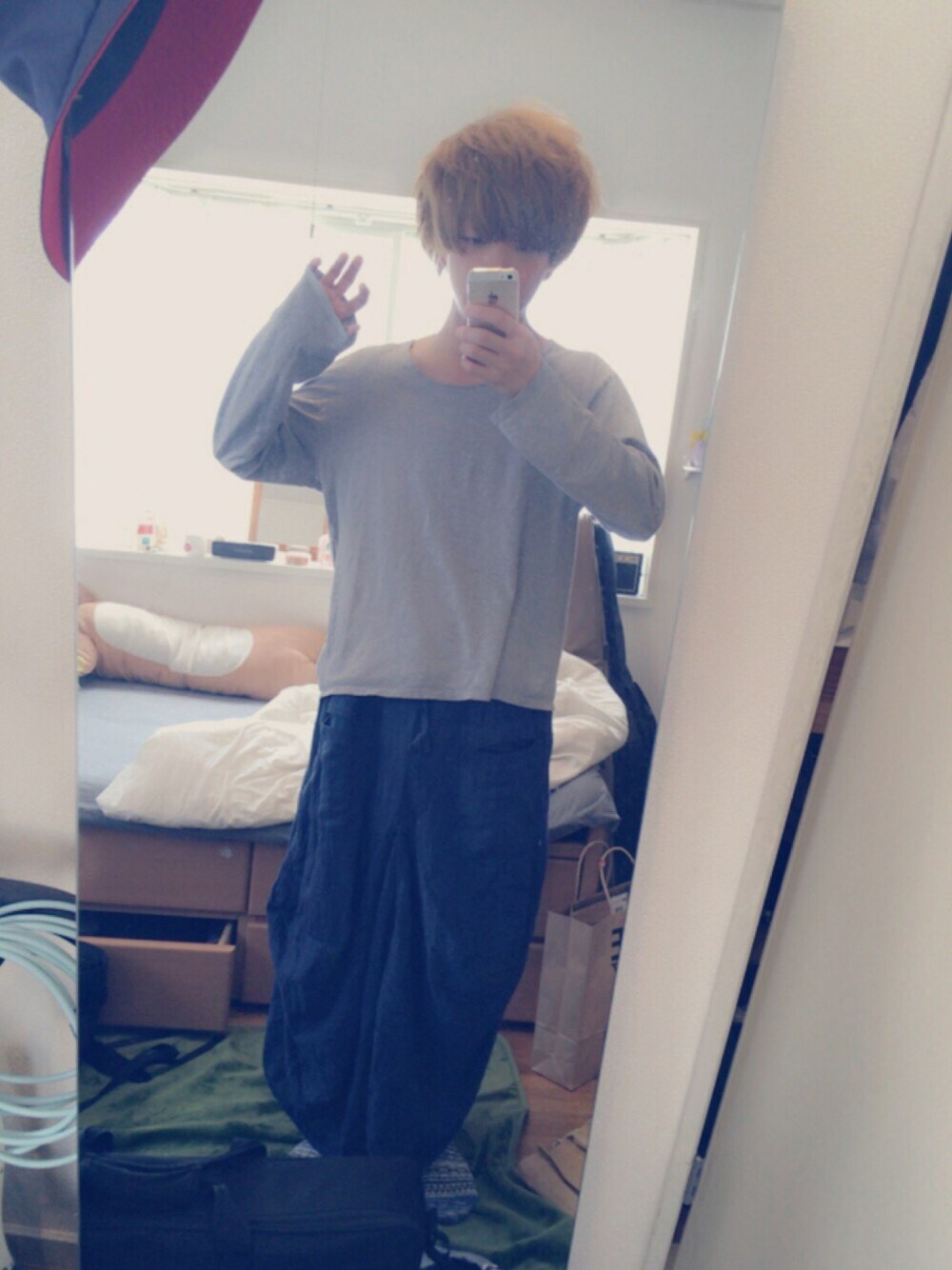 ロンドンのMUJIでパジャマ用に買ったカットソーの形が可愛くてすき。むげん堂のメンズスカートはサルエル感覚で履いてます。スーパー楽ちん。