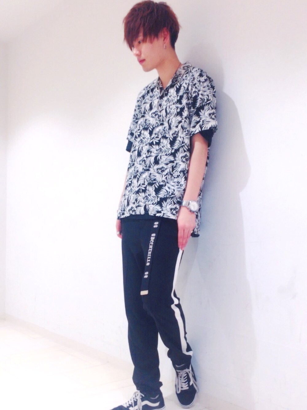 今っぽい開襟シャツとランパンツを合わせました!カラーは白黒モノトーンでまとめて派手めなボタニカルがらもシンプルに合わせてます!