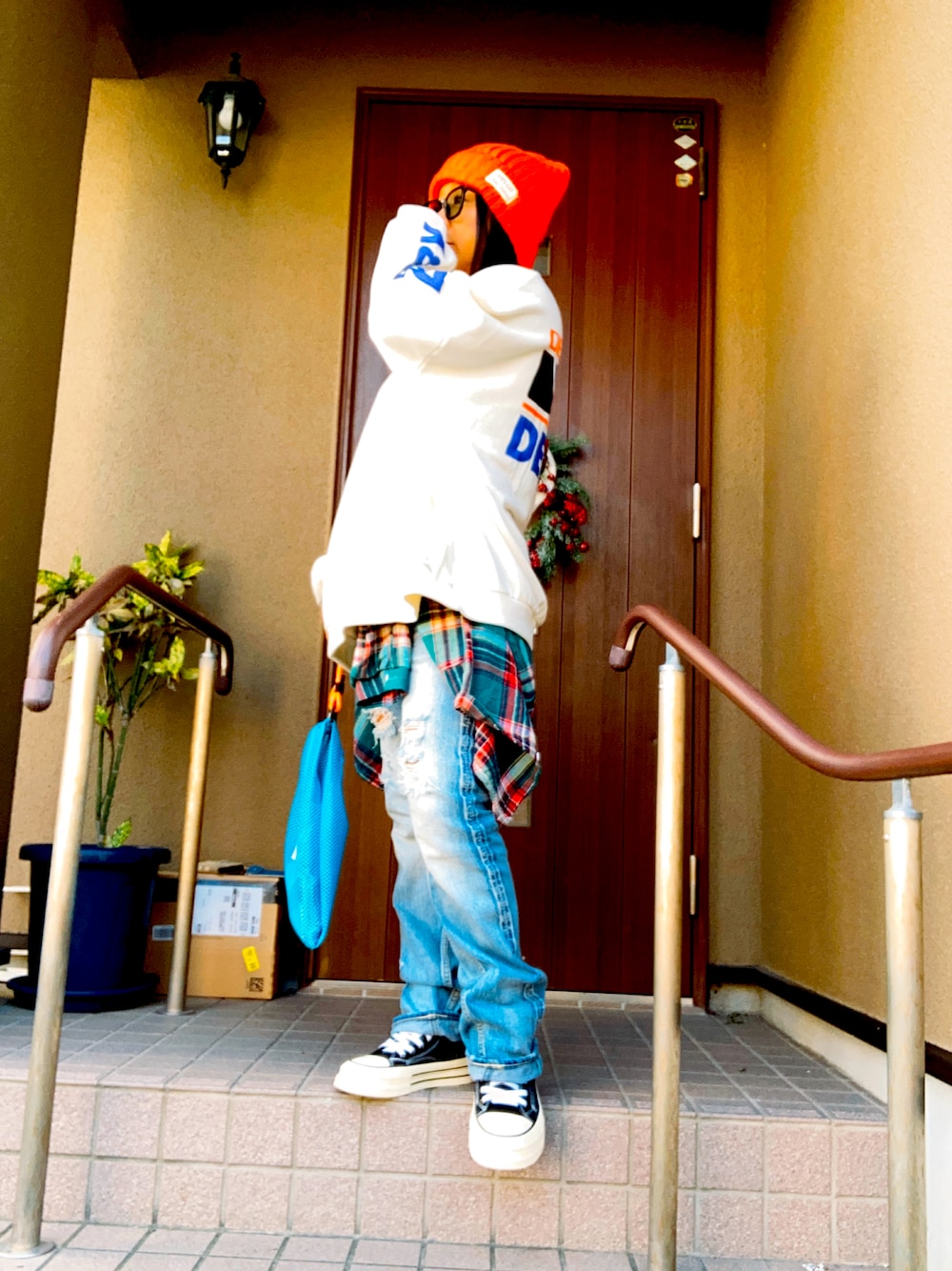 RODEOのスタッフさんかな? このトレーナーでコーデしてたのを参考に 着てみましたー♡ ユルコーデで、腰に巻いたチェックシャツがいい感じだと思うのですが( ˆ꒳ˆ; ) どうかな? RODEOのビーニーは ビビットなカラーで大好き!