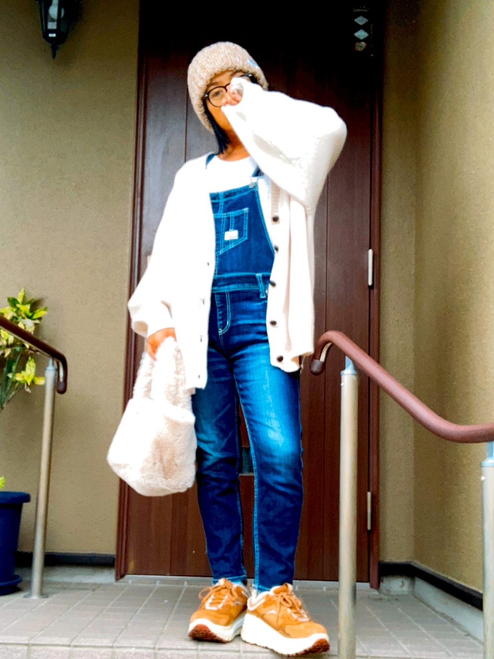 お昼寝しちゃって急いで着替えて お買い物に💦 顔パンパンにはやっぱりダテメでニット帽 (笑) オーバーオールにゆるカーではやっぱり パパっと着ても可愛いなぁ♡ 靴はあったかUGGのスニーカー👟 RODEOのニット帽はもう何年もかぶってる! そして、今回、SHEINのフワモコバックが とんでもなく優勝! 手触りもなんかしっとりフェイクファーで 品番書いておこうかな! 商品ID 43822131 セールで900円以下と思いますよ!
