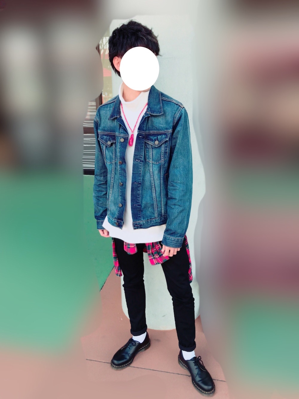 インナーのタートルネックとアウターの ジャケットは オーバーサイズでゆるっと可愛く着て 足元は革靴と黒スキニーで 引き締めました♪ 腰に巻いた赤のネルシャツと バンダナネックレスによって より印象的なファッションに!