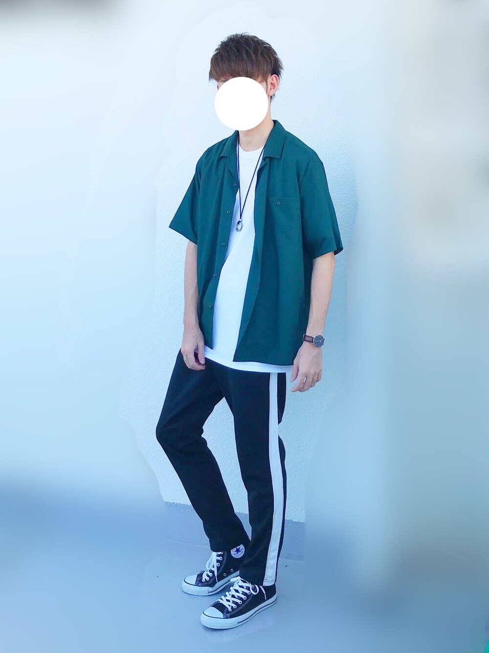 ラインパンツと合わせる事で 少し個性を出してみました🔥 グリーンのオープンカラーで 落ち着いた雰囲気に◎ モノトーン⚪️⚫️×グリーン🌿 コーデ! Tops: M T-shirts: XL Pants: M