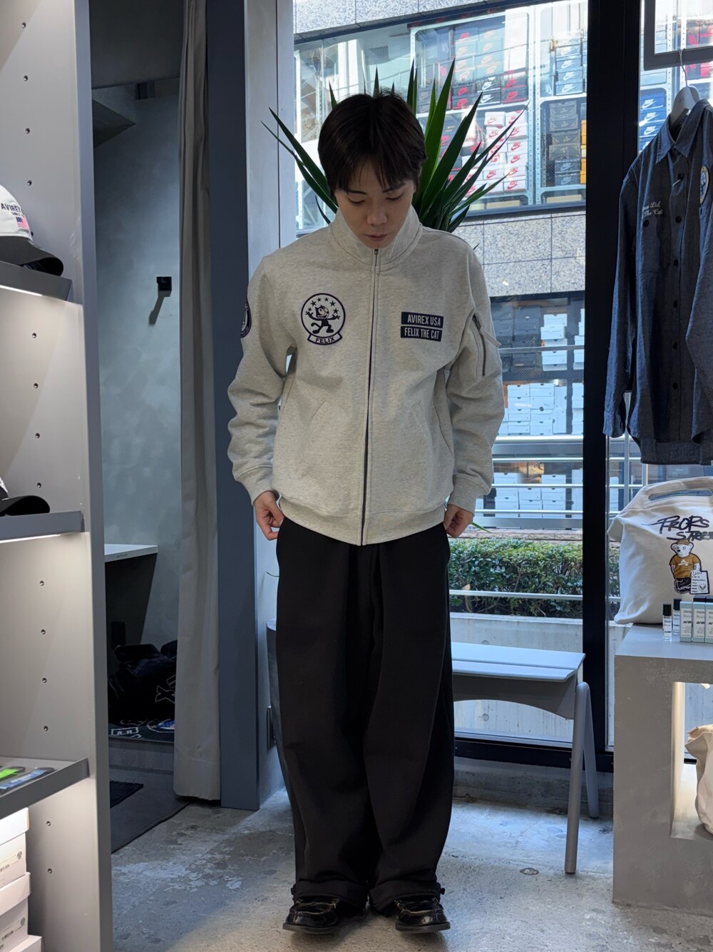 しんたろう(AVIREX 原宿店)のスウェット「《AVIREX × FELIX》SHEETING PATCH STAND ZIP SWEAT / シーチングパッチ スタンドジップ スウェット / アヴィレックス / フィリックス」を使ったコーディネート