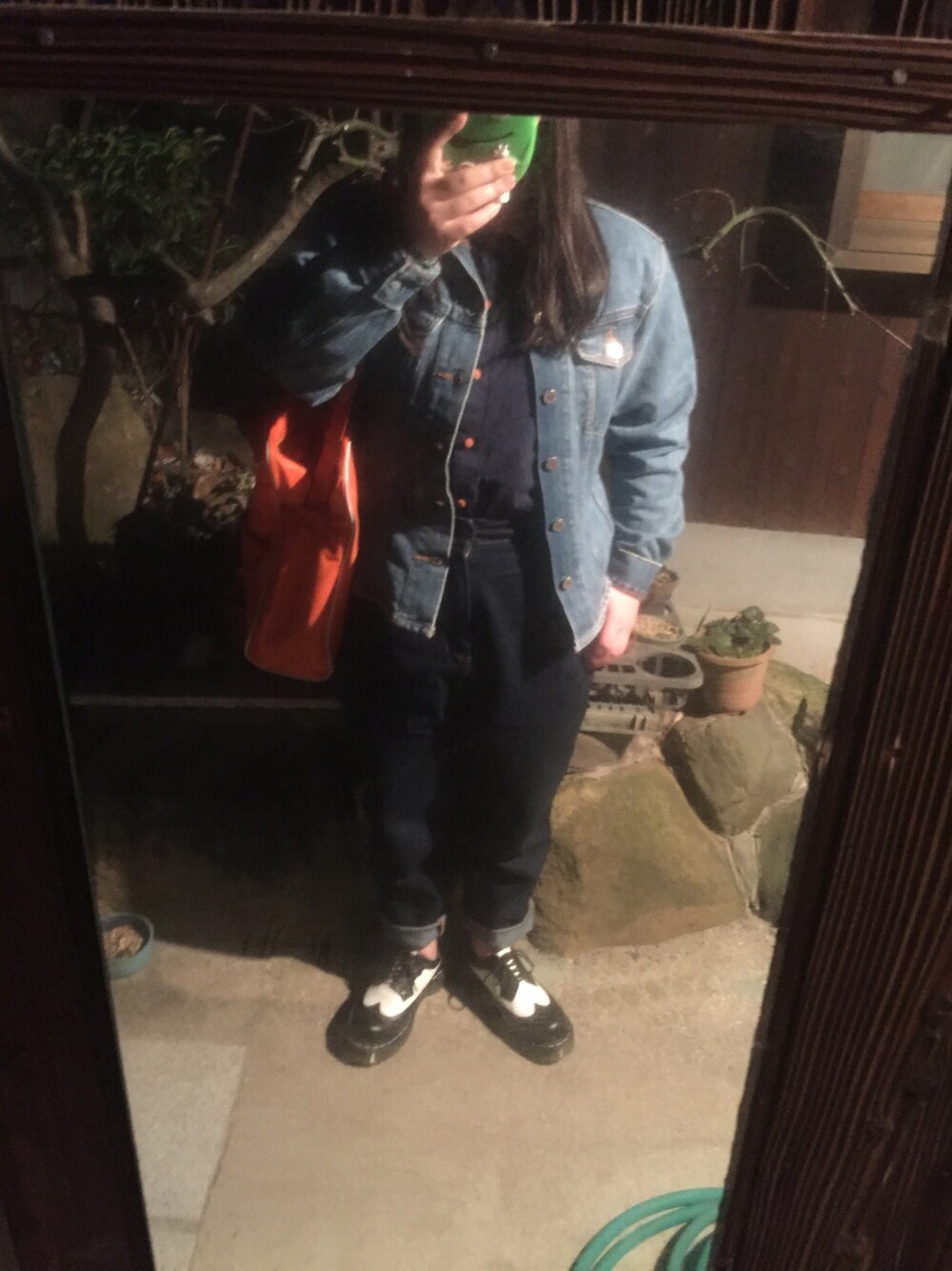 ワントーンかつデニムオンデニム 本間はデニムシャツにしようと思ったのですが、流石にむつごくなったので紺の襟が可愛いシャツに変更しました笑 帽子がレトロチックでとっても可愛いくてお気に入りです ヒトメボレして買いました マーチン乱用中😀