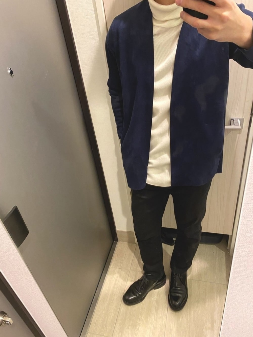 ノーカラージャケットと相性の良いタートルネックセーターでコーデ。 普通のジャケットだとドレッシー過ぎになる組み合わせだが、ノーカラージャケットなのでバランスが取れてるはず。 チャッカブーツとスエードジャケットで高級感も抜群。
