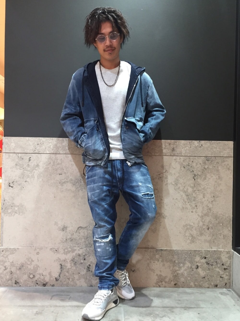 デニムオンデニムでどちらもjoggjeans😘 着心地抜群です。インナーはグレーのニットで夜の肌寒さにも耐えられます🙆 スニーカーのSKBはニット素材とゴムのソウルなので軽くて脱ぎはぎも楽チン🤘 17FWコレクションです🤗