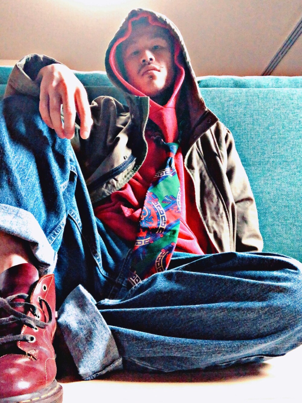 赤×青×緑コーデです 髪ボサボサなんでフードで