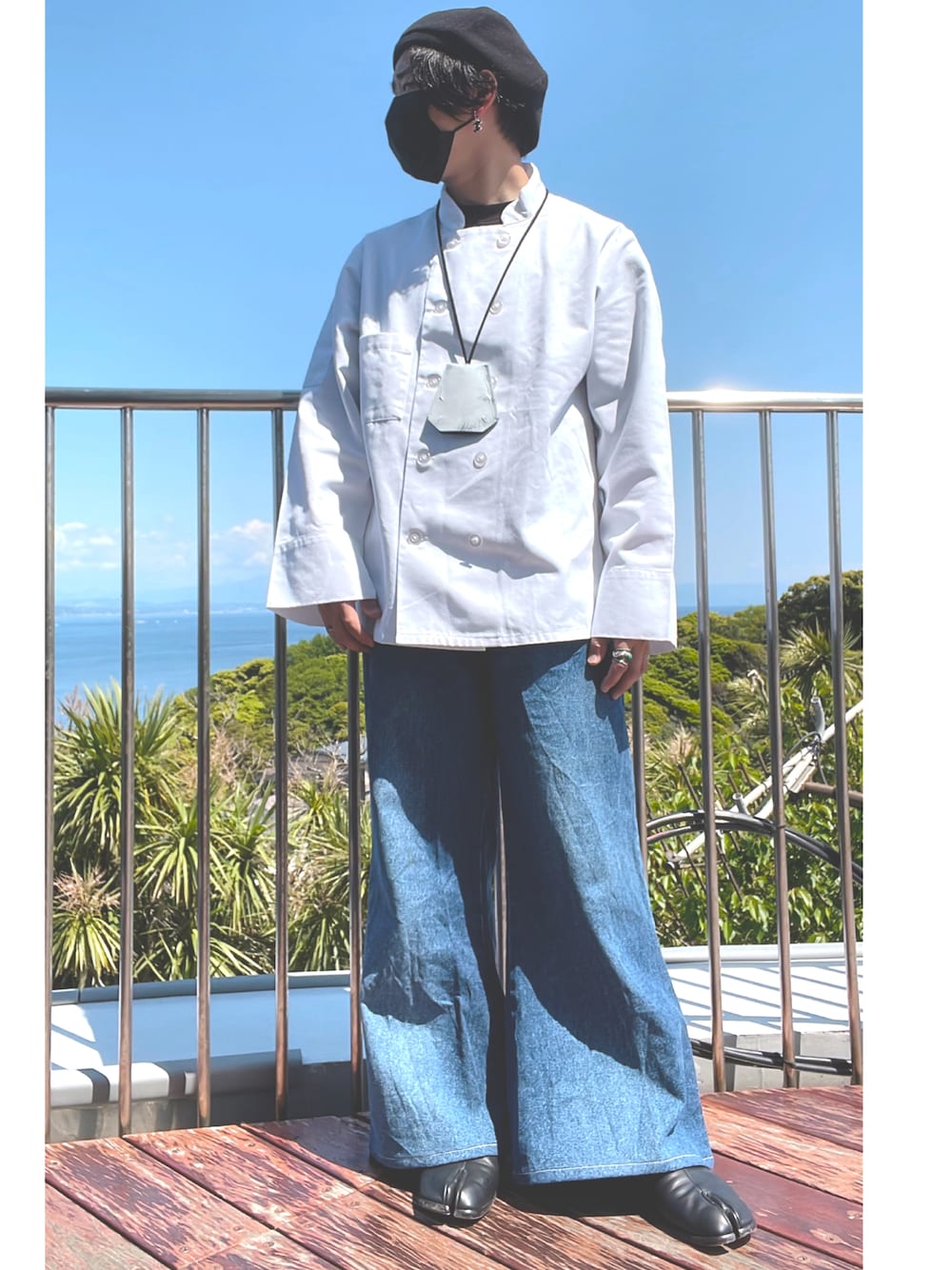 デッドストックのコックシャツがたまらなく可愛い。 70sのベルボトムのフレアもお気に。 アクセントはマルジェラ。