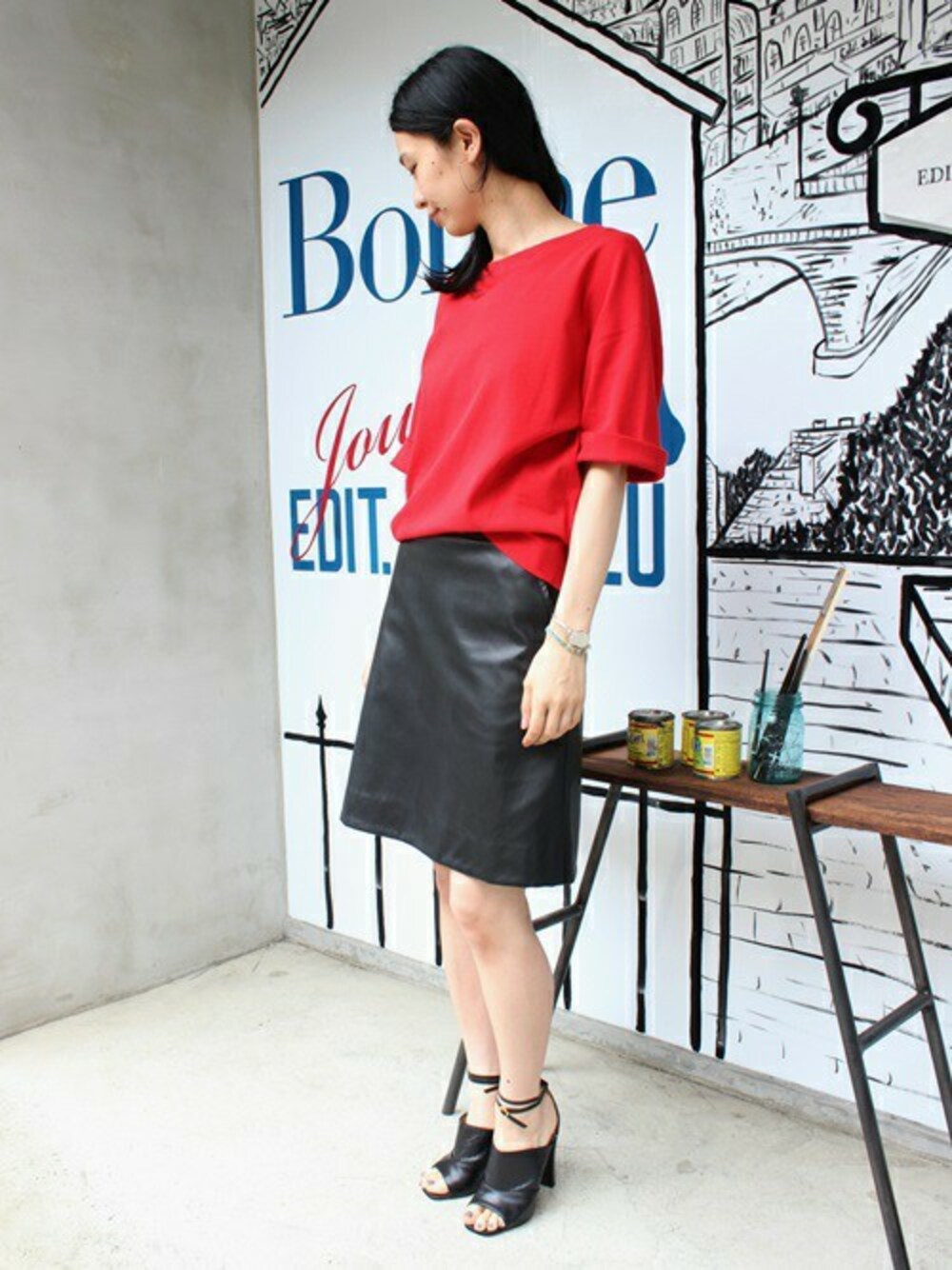 後ろZIP使いがポイントのレッドトップスを主役にブラックでまとめたコーディネート。 フェイクレザーのスカートで一足早めの秋スタイルです。もちろん盛夏にもおすすめ!