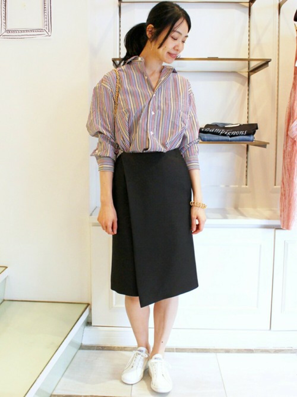 ストライプ柄が可愛いインディビジュアライズドシャツのストライプシャツ。 タイトスカートと合わせてシンプルにコーディネートしました。 足元はラフにスニーカーを合わせてカジュアルさをプラス。