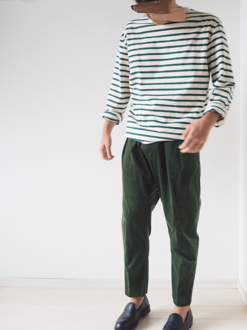 スタンダードジャーナルのバスクシャツにNEATのフレンチコーデュロイのテーパードパンツ。 シンプルグリーンコーデ。🌲🌿🌴