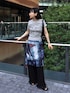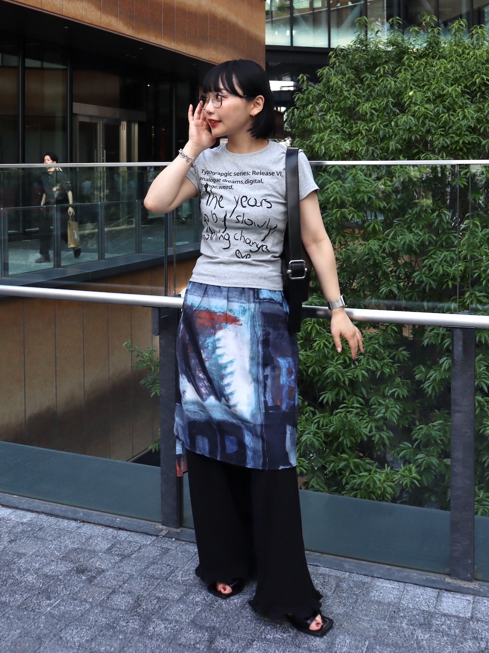 アート柄スカートを主役に、 ロゴTでほどよくカジュアルダウン。 スカートが抜け感を演出してくれます。 コンパクトなトップスとワイドパンツでバランスよく仕上げました。