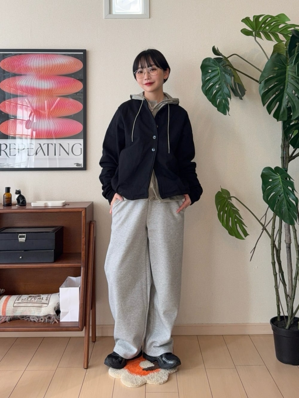 黒をベースに、 インナーでフードを仕込んだレイヤード。 スウェットパンツ合わせでも、 トップスをコンパクトにすることで 全体が重く見えないように。 ゆるさはあるけど、 だらっとしすぎないバランスを意識。