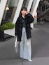 ボリュームのある黒のアウターを主役に、インナーは深みのあるグリーンで重たくなりすぎないように。 ダメージ入りのワイドデニムでラフさを足して、足元はシャープなシルバーで締めました。 トップに重さがある分、ボトムは落ち感のあるシルエットで縦ラインを意識。 シンプルだけど素材とシルエットでメリハリをつけたコーデです。