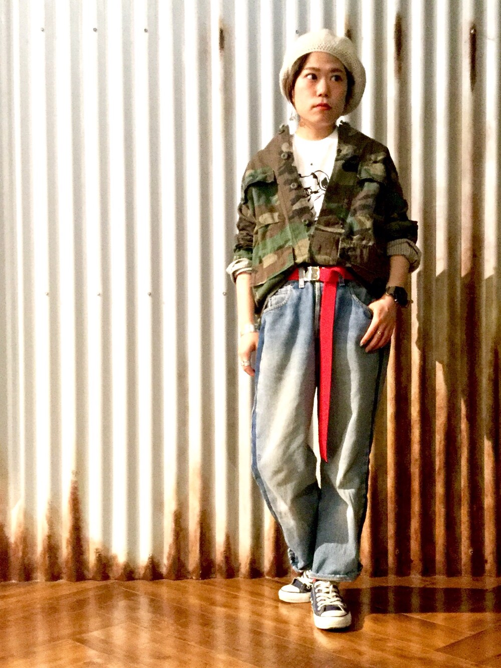 おかものミリタリージャケット「加工ファティーグジャケット リップストップカモフラージュ」を使ったコーディネート