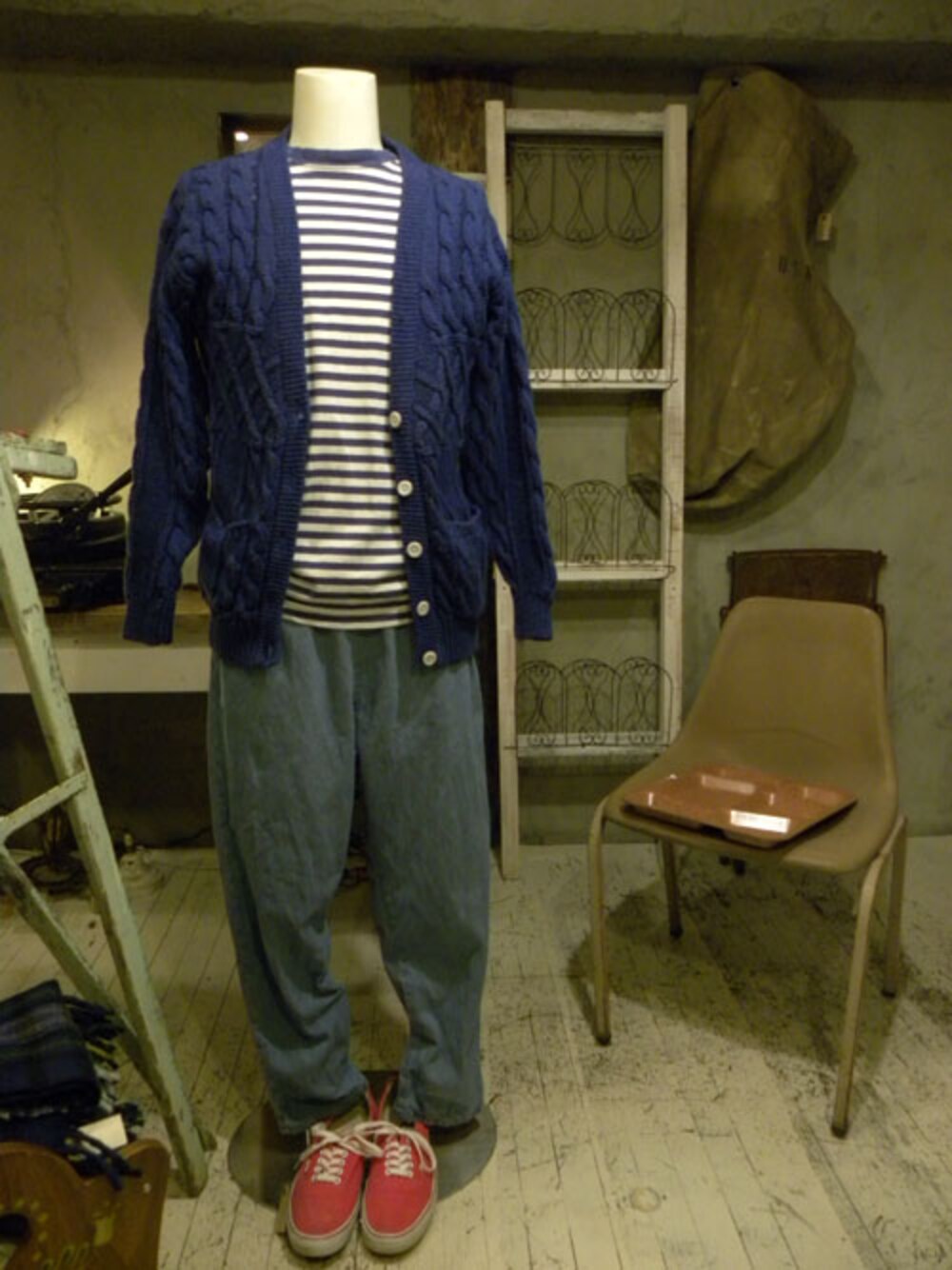USED ボーダーT USED コットンラミーのカーディガン USED デニムイージーパンツ USED VANS シューズ