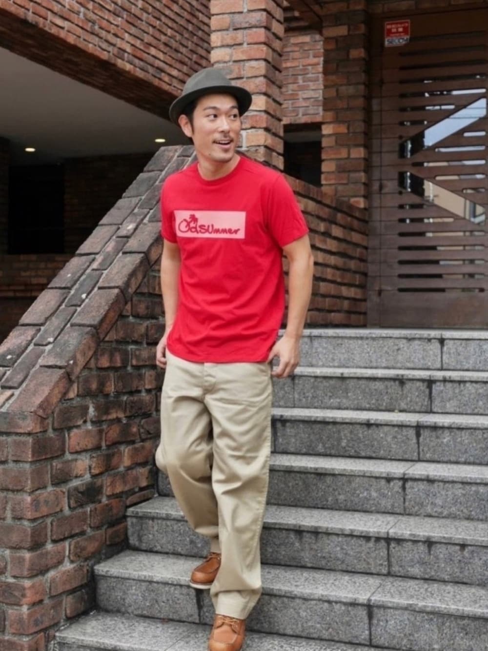 定番BOXロゴTシャツから新色RED🌴 . ブラウン系のコーデの中で赤Tシャツがアクセントに! . オールドサマーのアイテムについて、詳しくはプロフィールのパソコンマーク🖥からサイトに飛べます✈️