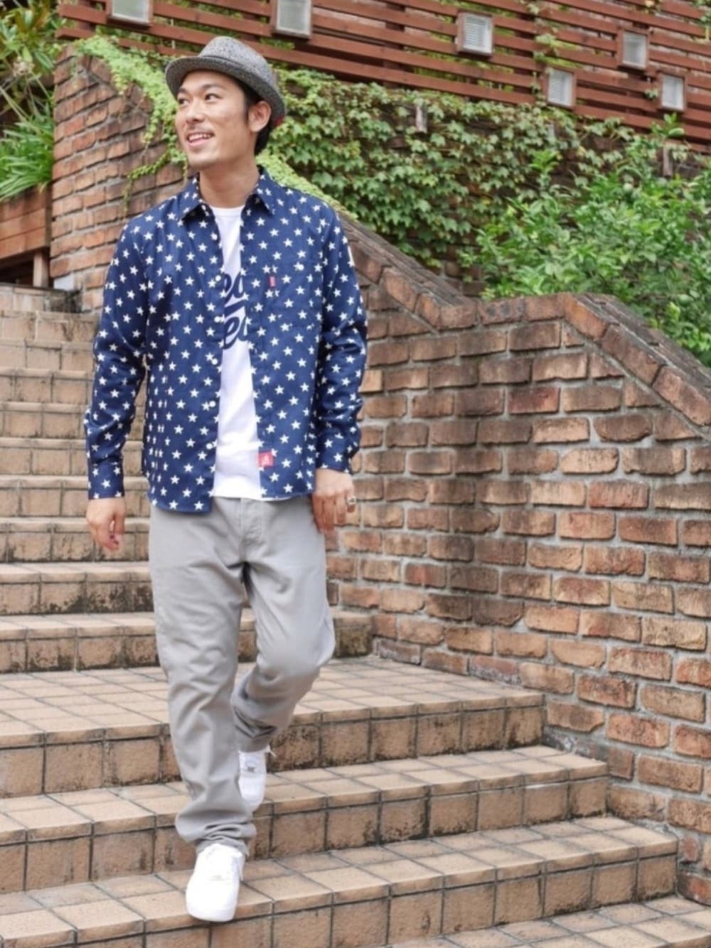 新作星柄シャツ✨ . グレーのチノパン、ハットと合わせたスタイリッシュなコーディネート😎 . . オールドサマーのアイテムについて、詳しくはプロフィールのパソコンマーク🖥からサイトに飛べます✈️