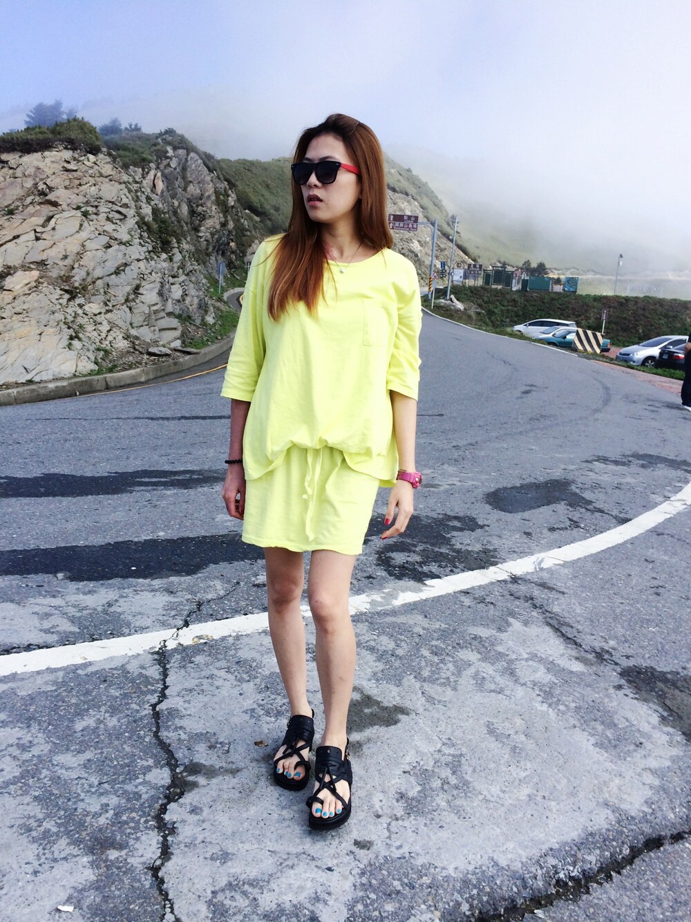 イエロー系のワンピースを着用したレディースの夏コーディネートの1枚目の写真
