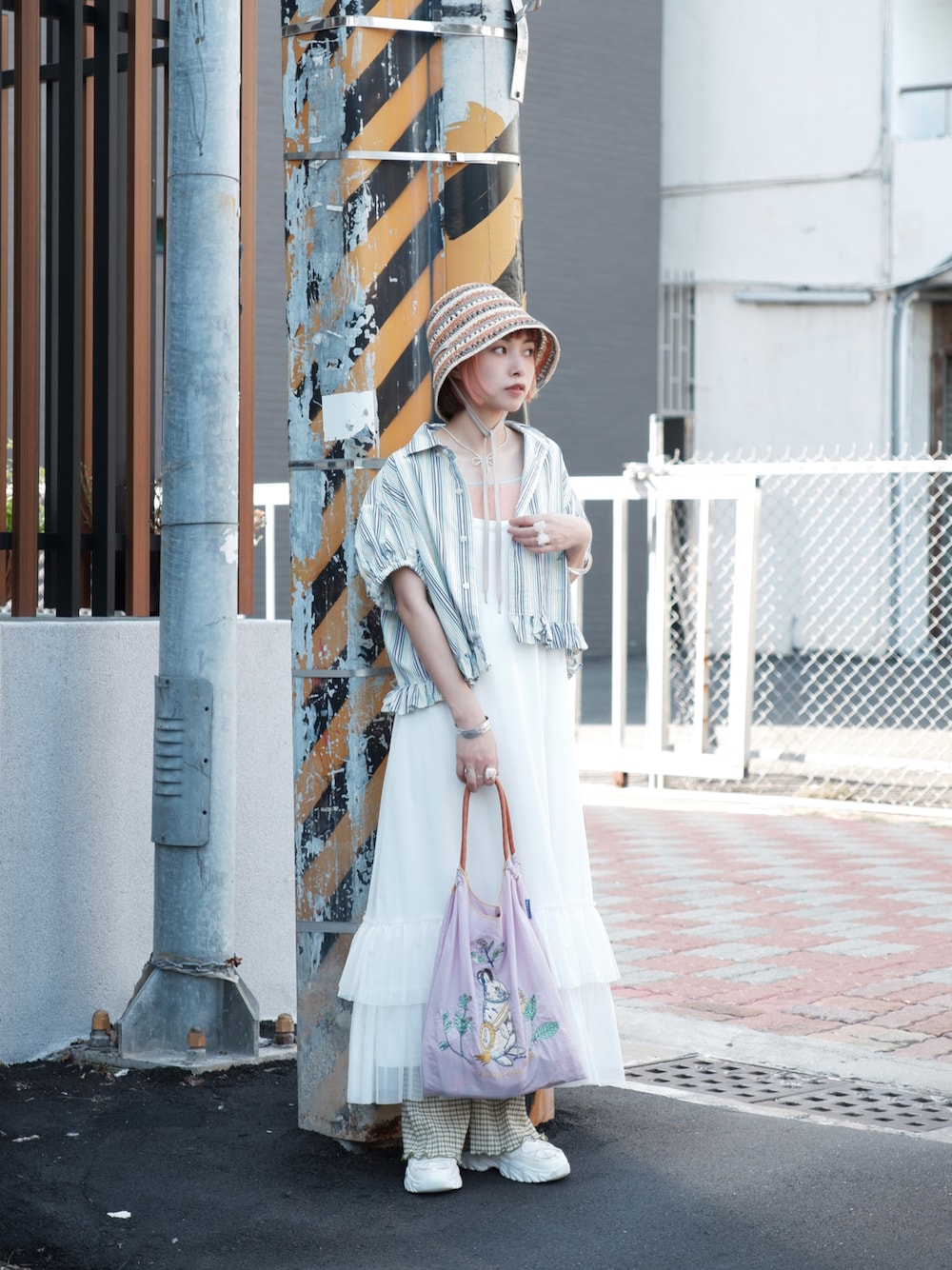 Olivia Lanのハット「OVERRIDE RAFFIA CROCHET TULIP」を使ったコーディネート