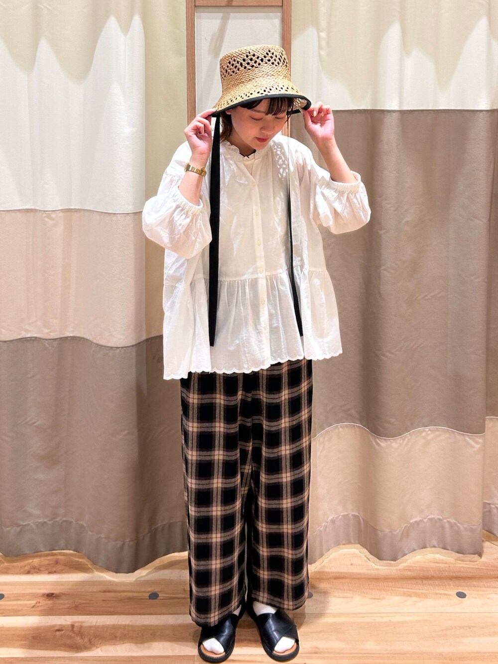 ご覧いただきありがとうございます🫶🏻 裾のスカラップがポイントのブラウス🎀ˎˊ˗ 大きめチェックのパンツがコーデを引き立ててくれます✨パンツは接触冷感とUVカット付きなので これからの時期大活躍しそうです🌞👋🏻