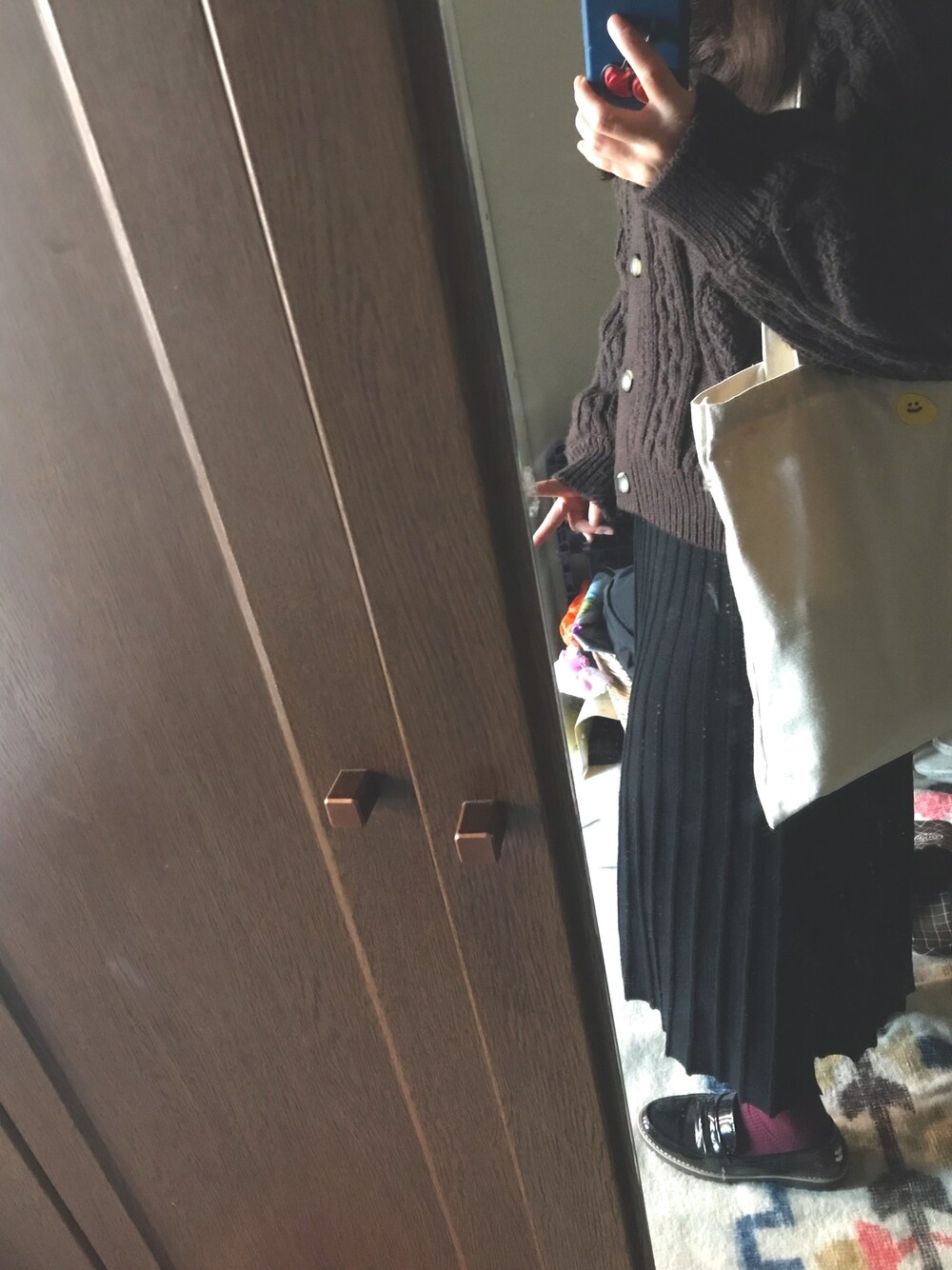 ブラウン系のニット/セーターを着用したレディースの冬コーディネートの1枚目の写真