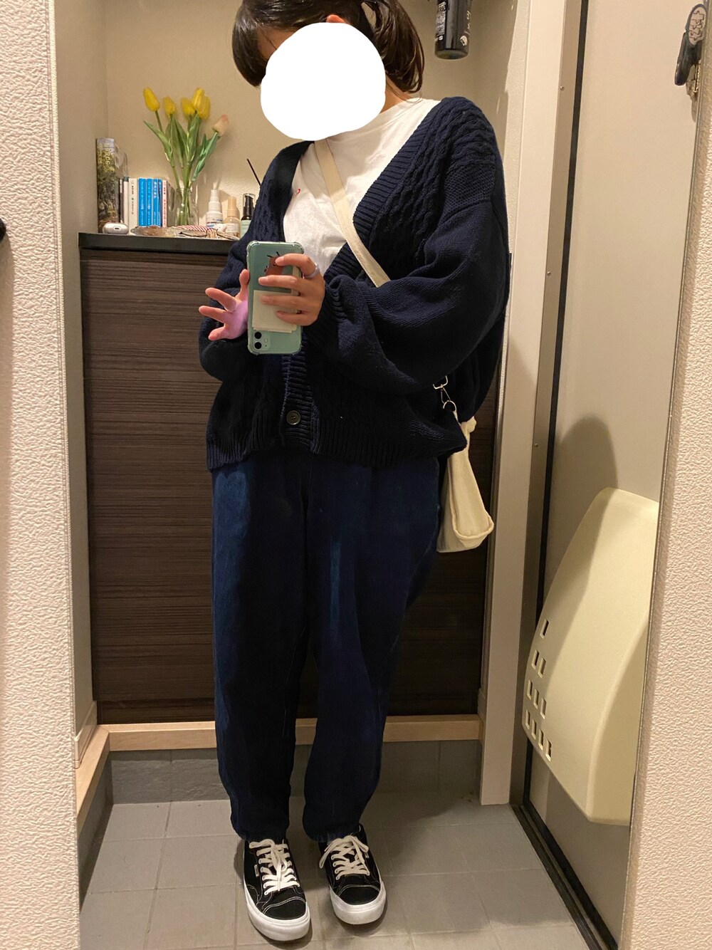 ブラック系のシューズを着用したレディースの秋コーディネートの1枚目の写真