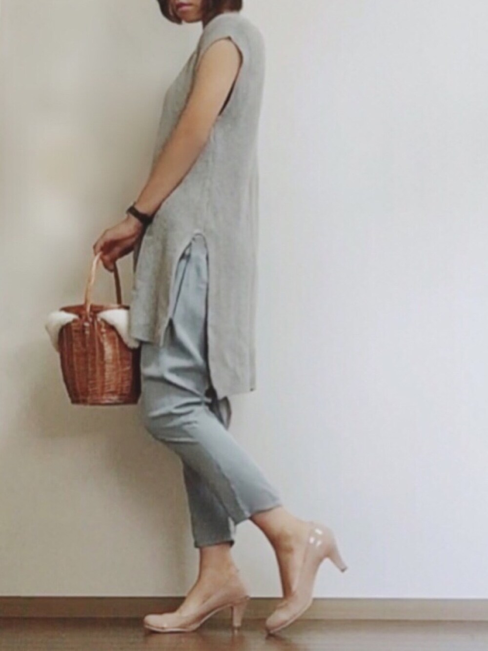 mameのニット/セーター「5ゲージアゼロングベスト 717168」を使ったコーディネート