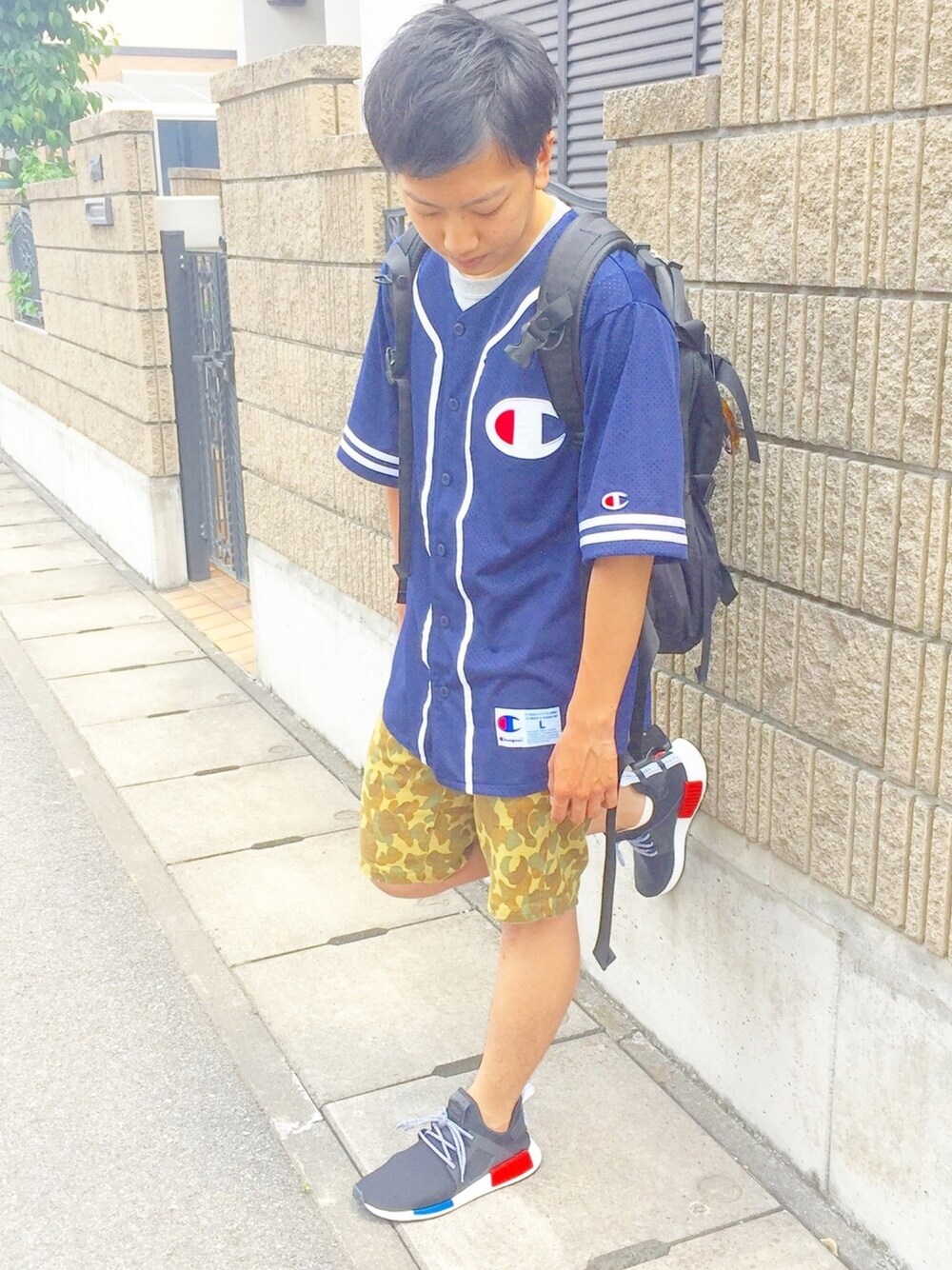 ベースボールシャツ🤤 ビックシルエットでいい感じ チャンピオンのロゴとnmdのogカラーの相性良い🤞 今日も暑いけど頑張ろー