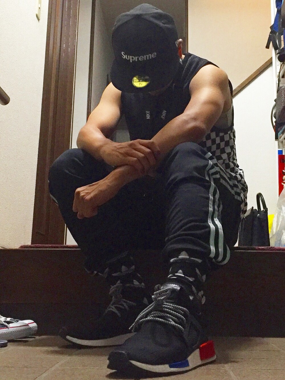 実はリフレクターのパンツ!! これからは黒系白系の服で統一したい めちゃアディダスって感じのコーデでした〜