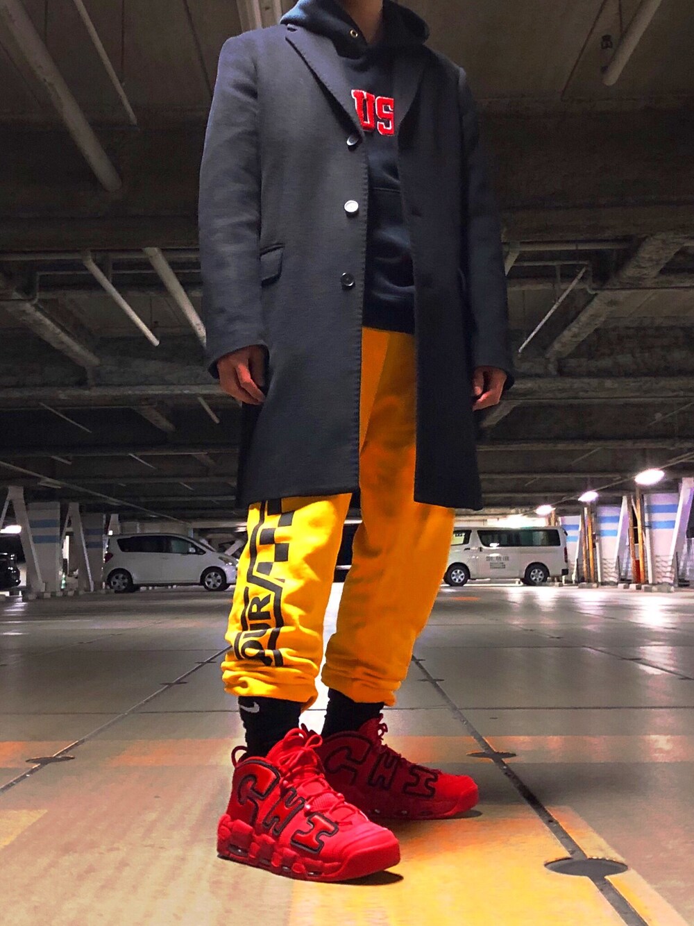 シャワー浴びて友達と撮影会 このパンツにチェスターコートは新鮮な組み合わせ。 黄色と赤の組み合わせはあのハンバーガー屋さんを彷彿させるカラーです。🙄