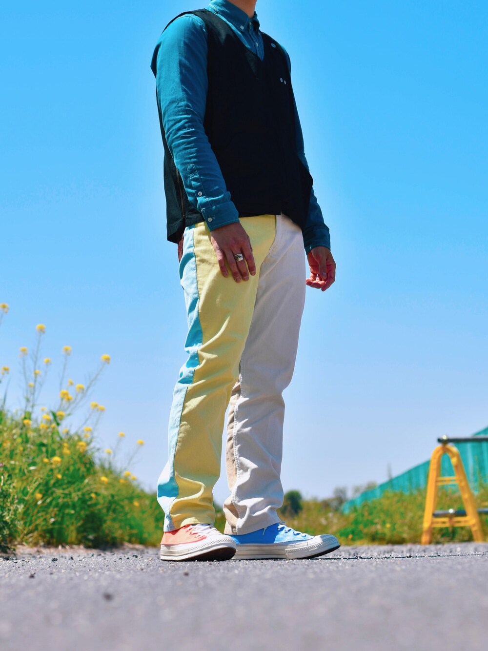 左右非対称のパンツとスニーカー履いたので色んな方向から見ると違った雰囲気を楽しめます^_^