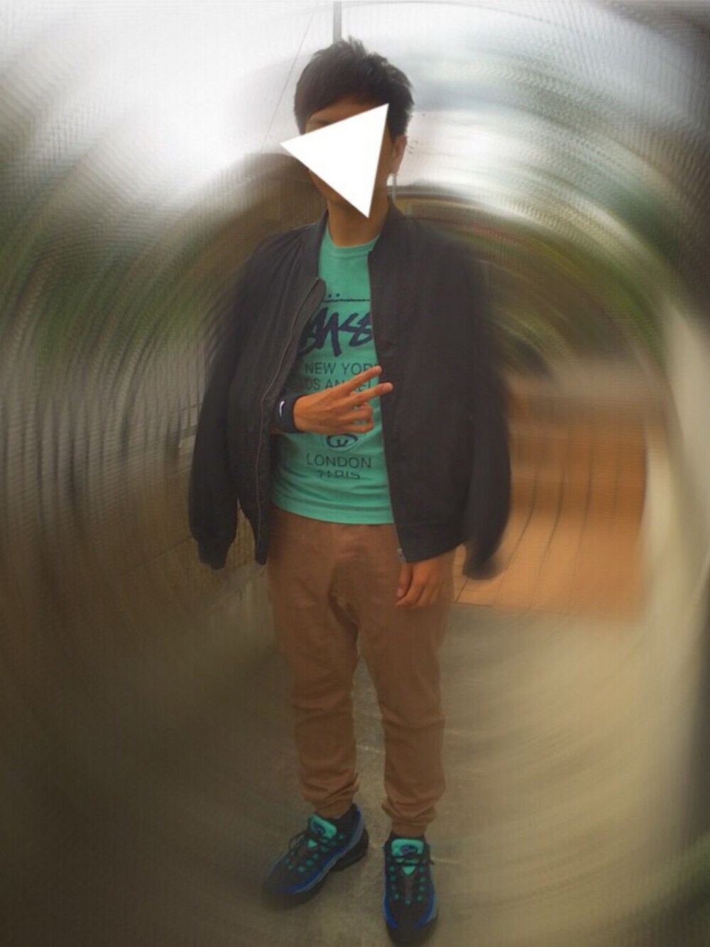ステューシーのワールドツアーTシャツとエアマックスの色を揃えてまとまり感を出しています。