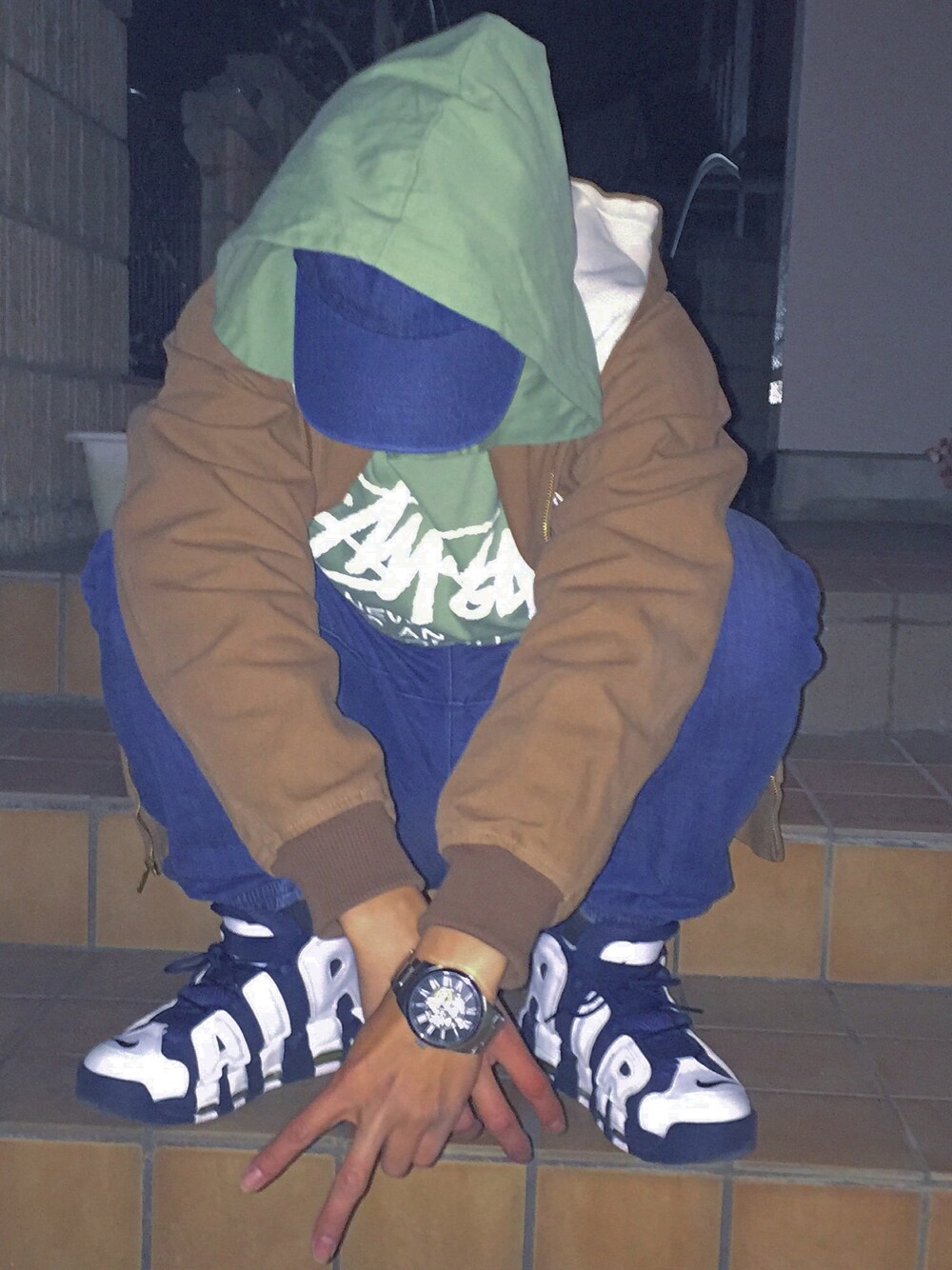 昨日買ったモスグリーンのstussyロンTパーカーを来て外行ってきました 個性的でいい色だな〜