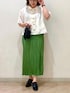 フリンジのシャツは気になる二の腕まわりも隠せてショート丈なので、パンツでもスカートでも合わせやすいです◎ グリーンのお色味がとても綺麗なプリーツスカートはラインを綺麗に見せてくれるので着痩せ効果抜群です◎