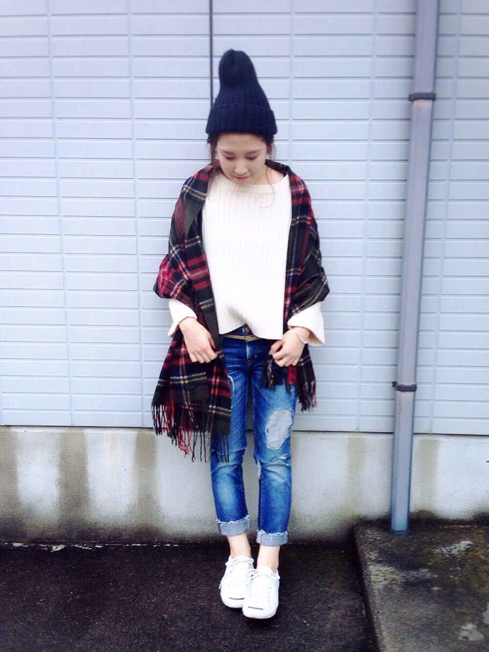 お休みコーデ 帽子がぺこりしとーる🙆 今日届いたばかりのニットがとっても可愛い❤️ リアル👭のyuuuu♪とランチしてきました🙆 フォローしてる中におります🙈