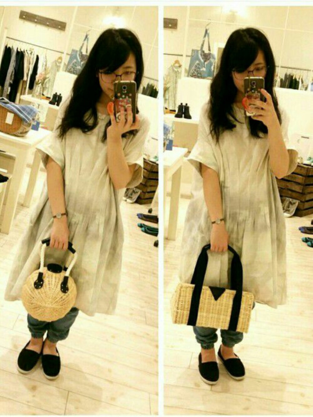ワンピースは水彩画テキスタイルデザイナー伊藤直美さんコラボ。色合いがたまらないです。シルエットもかわいい! ラタンバッグはbloc oiseaux、積み木をテーマに作られたデザイン。丸も三角もかわいくて選べません…