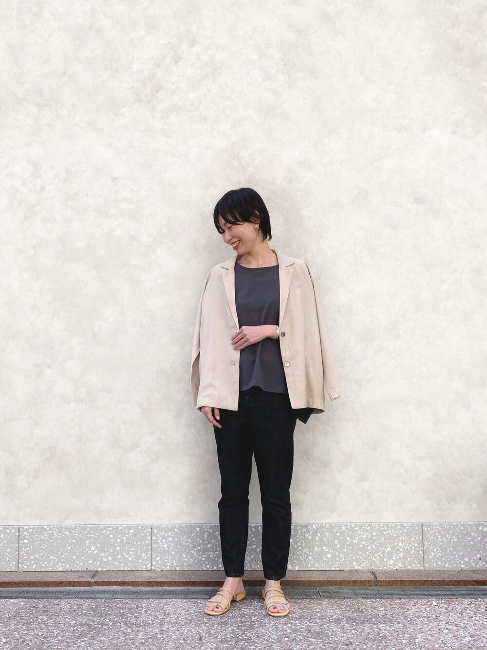 シャツジャケットは麻見えするサラッとした着心地。 軽めなので、夏にもオススメです! ポンチョTは形が可愛い^ ^ 腕は通す所を変えるとシルエットも変わります。 デニムテーパードパンツはお気に入りで、履くだけで決まるラインです。