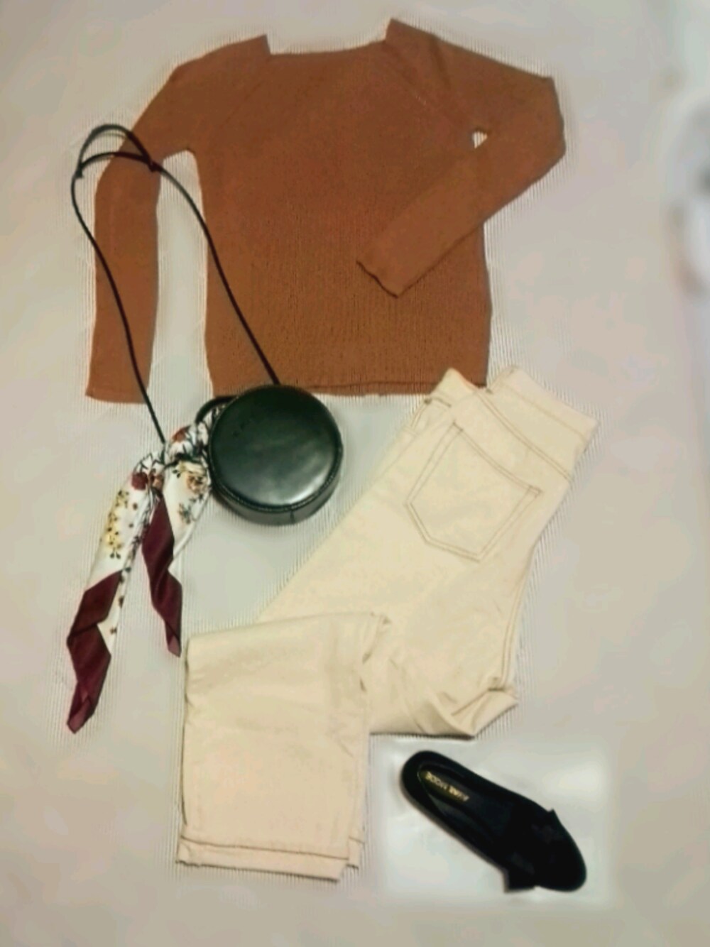 自分のWEAR見てると最近オレンジ🍊っぽい服ばっかり着てますね。 今回のオレンジ枠w ことリブニットは、商品説明は「オレンジ」ですが光によってピンクにもブラウンにも見える絶妙な色味がすきです。実際にはくすんだサーモンピンクって感じです。襟ぐりがスクエアネックで幅が広めなので、けっこう鎖骨が出て大人っぽいイメージになります。 ピンク系の色にグリーンを合わせるのがすきなので、深緑色が綺麗なまんまるバッグにしました。一見秋っぽい色だけど意外とどの季節のコーデにも馴染むので気に入ってます。 スカーフってthe大人女子アイテムって感じで使いこなすには自分の中でまだハードルが高くて、バッグにちょろんとつけるのが限界です 靴はこの写真だとわかりづらいのですが、スエードっぽいローファーでフロントに黒いリボンがついてます。