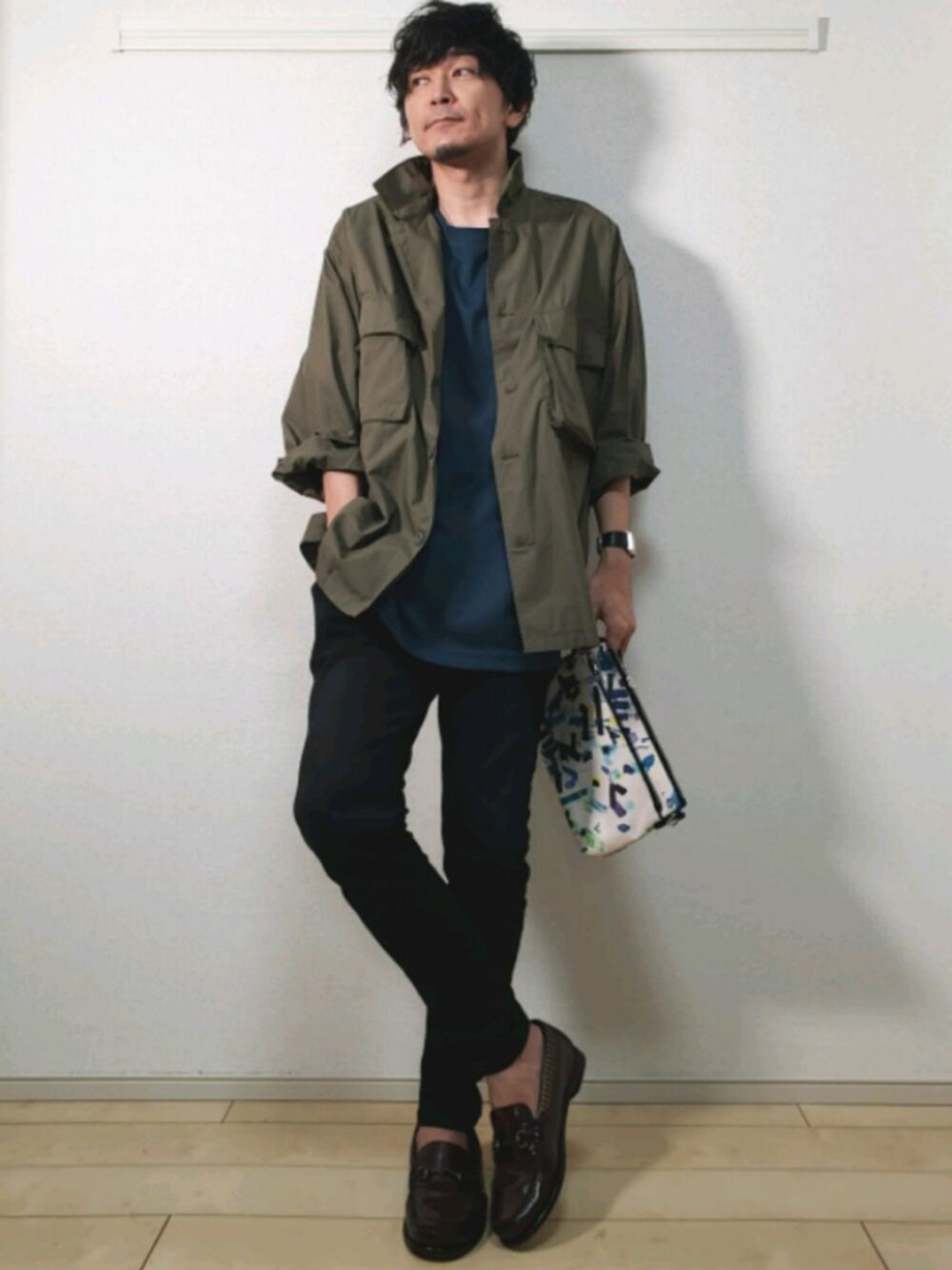 ミリタリーのコーディネート。 軍モノの特色は、無骨で男らしく渋い印象がある反面、土臭く、暗めな印象も持っていますよね。 「なんか暗いなー」と思ったので 明るめの小物を足して、バランスを取る という手を使ってます。 クラッチ以外なら、靴、キャップ、インナーのTシャツなどに明るい色を差すとかもありかな。 「印象」って、バランスを整えていくことですもんね。