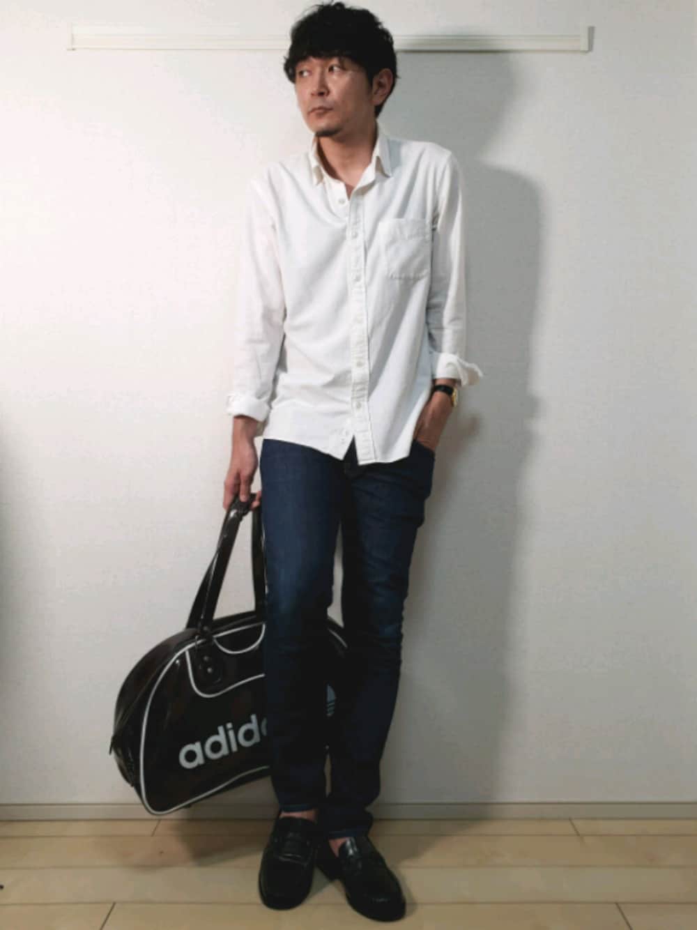 白シャツコーデはシンプルになりがち。 なので、小物でちょっとアクセントを着けたりします。 この写真では adidasのPVCタイプのレトロなボストンバッグを使っています。 メルカリで4000円くらいでした。 (あ、PVCはビニール素材のことね)