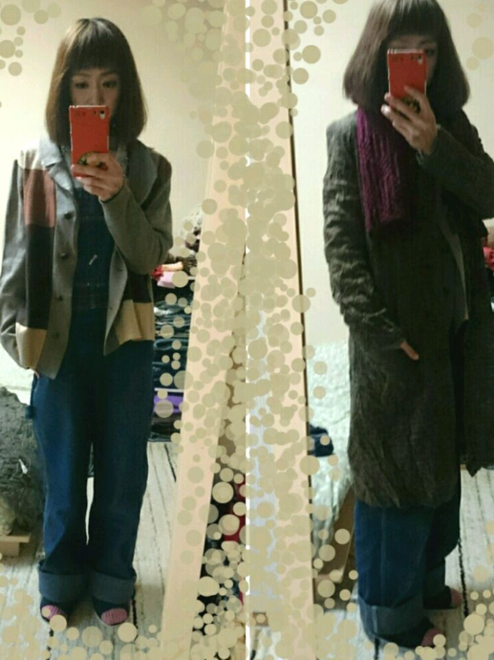 少し前の暖かめの日 なかなか出番の無かったクシュクシュ素材のコート 襟元がチャイニーズっぽく?なんて言うのかわからなんが。 ちとそのままだと、お婆ちゃんみたい風味になるので、マフラーで隠してます(^-^; てか、全体的に、お婆ちゃんのおさがりコーデ風ですが‼